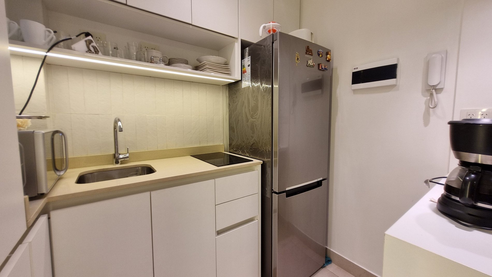 Fully equipped kitchen (refrigerator, electric stove, microwave, coffee maker, electric kettle, and complete set of dishes)
