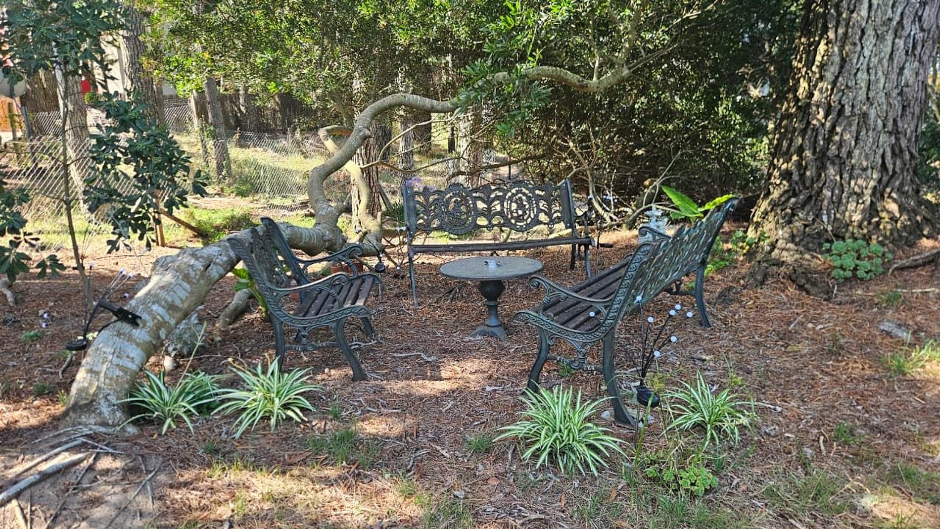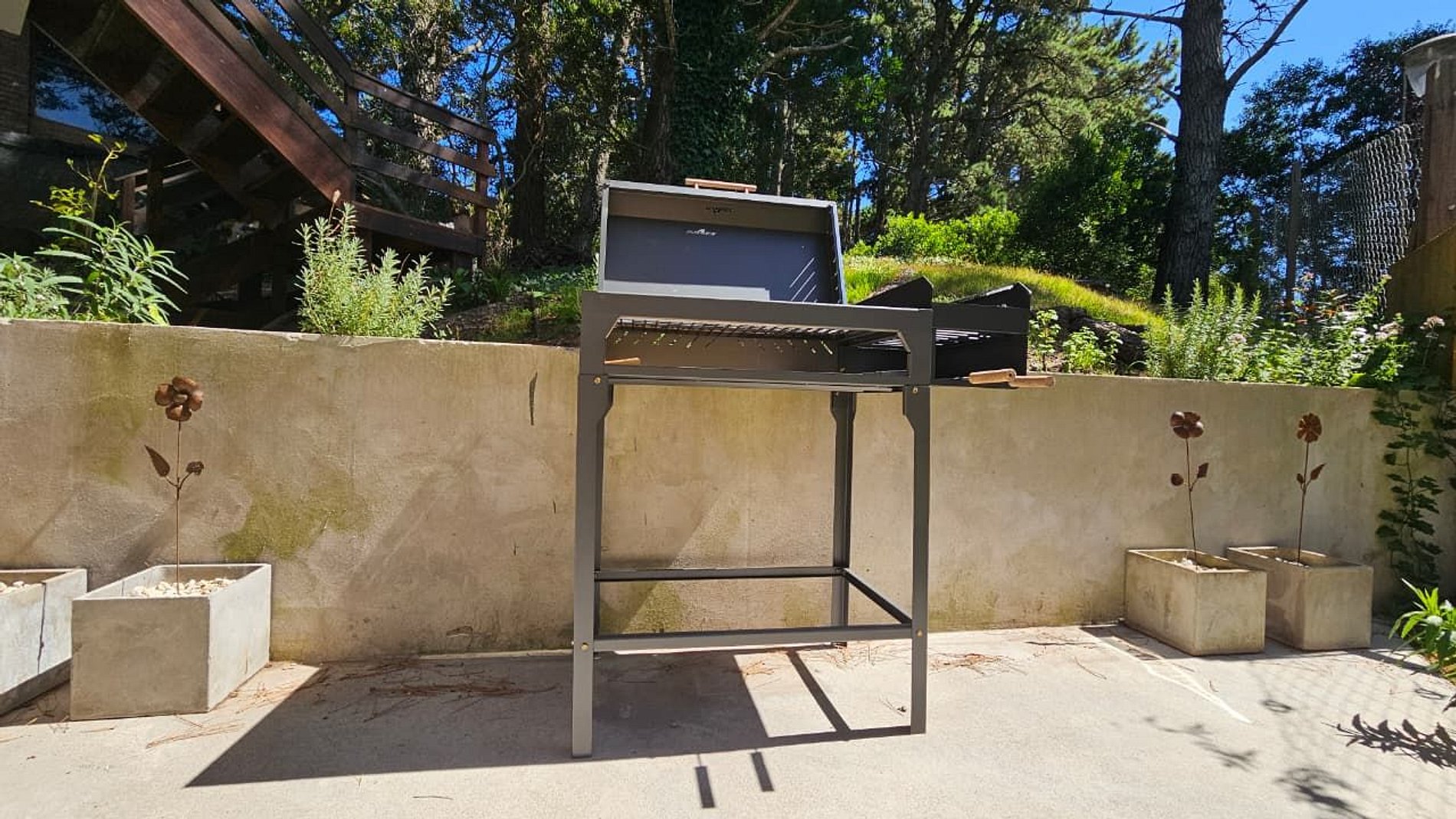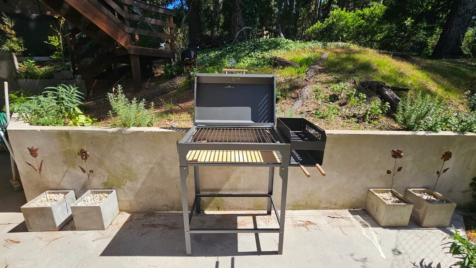There is a grill and a table with chairs in the patio to enjoy the forest surroundings.