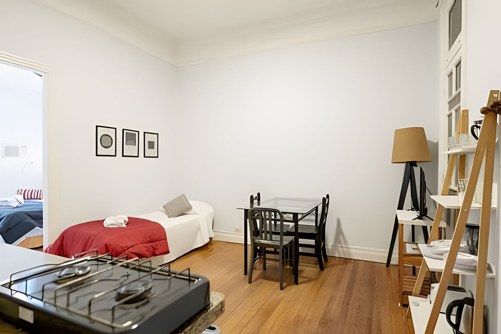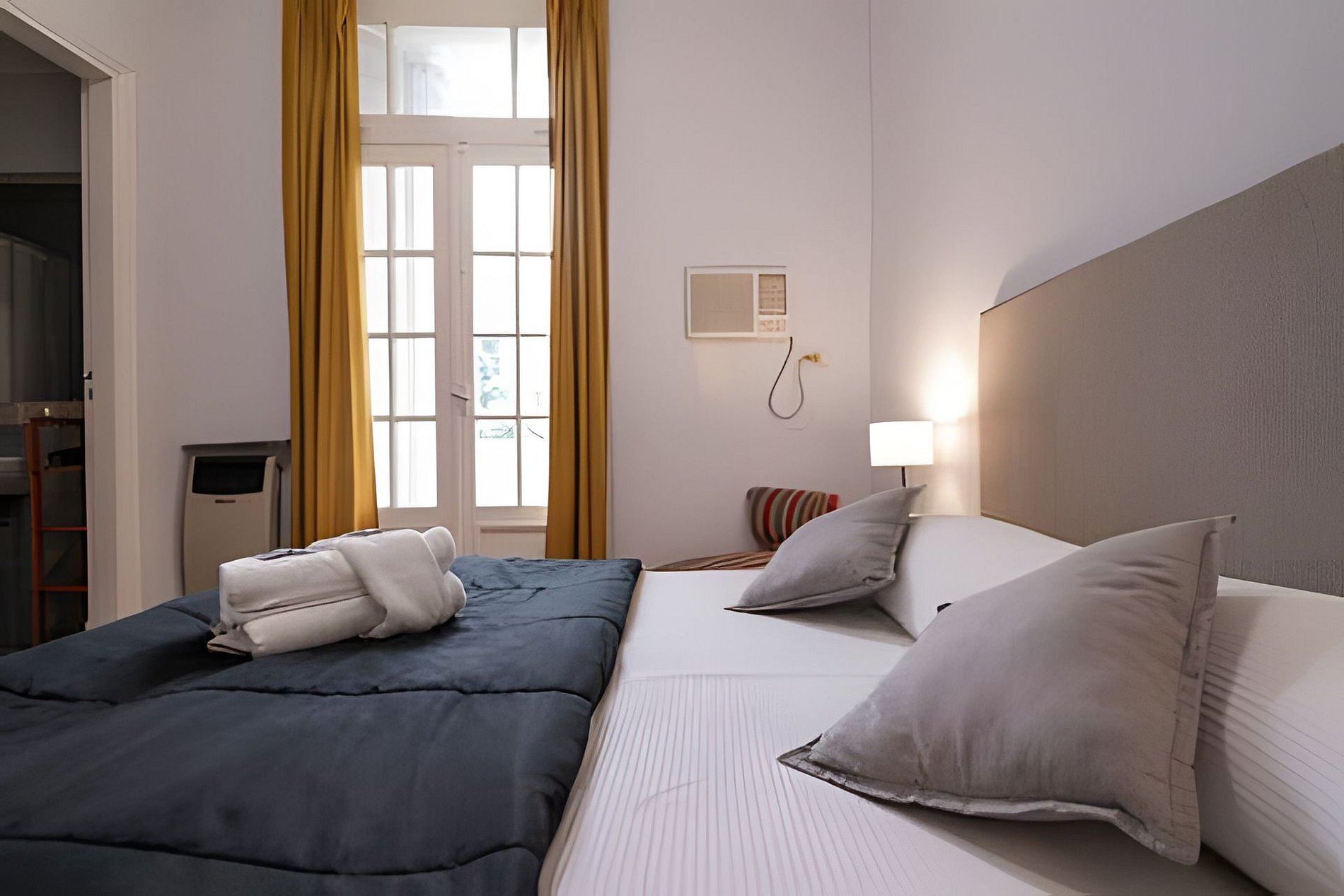 Beautiful, super cozy apartment for 3 guests. It features a double bedroom with a front balcony, open view, and plenty of greenery from the city. The living-dining area includes a single bed for a third guest, a full bathroom, and a fully equipped kitchen. There is a TV and air conditioning. The building has an elevator and a washing machine. The location on Avenida Jujuy, just steps from Avenida Rivadavia, is very convenient and well-trafficked at all hours. It is connected to all public transportation options. The building is entirely dedicated to tourist rentals and is managed responsibly. Attention to cleaning details. Elevator available. Washing machine in the building. For guest safety, there are security cameras in the entrance hallway and common areas of the apartments.