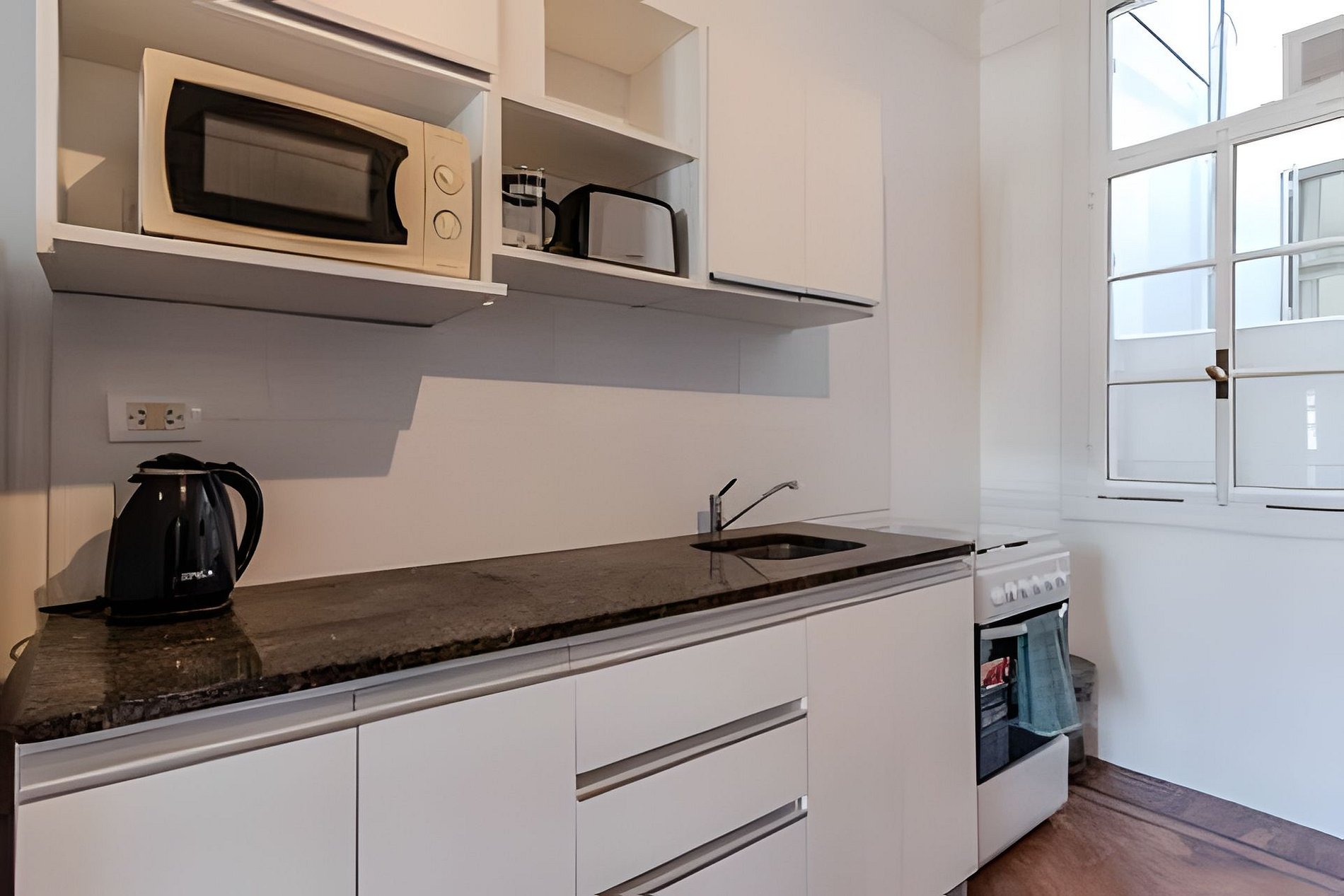 Classic-style apartment with high ceilings and spacious rooms. Located at the front with a balcony, it is very bright. Situated on Jujuy Avenue and just steps from Pueyrredón Avenue and Rivadavia Avenue, this apartment offers excellent access to all public transportation. It features air conditioning, gas heating, a double bed, and two single beds. Perfect for families. For guests' safety, there are security cameras in the entrance hallway and common areas of the building.