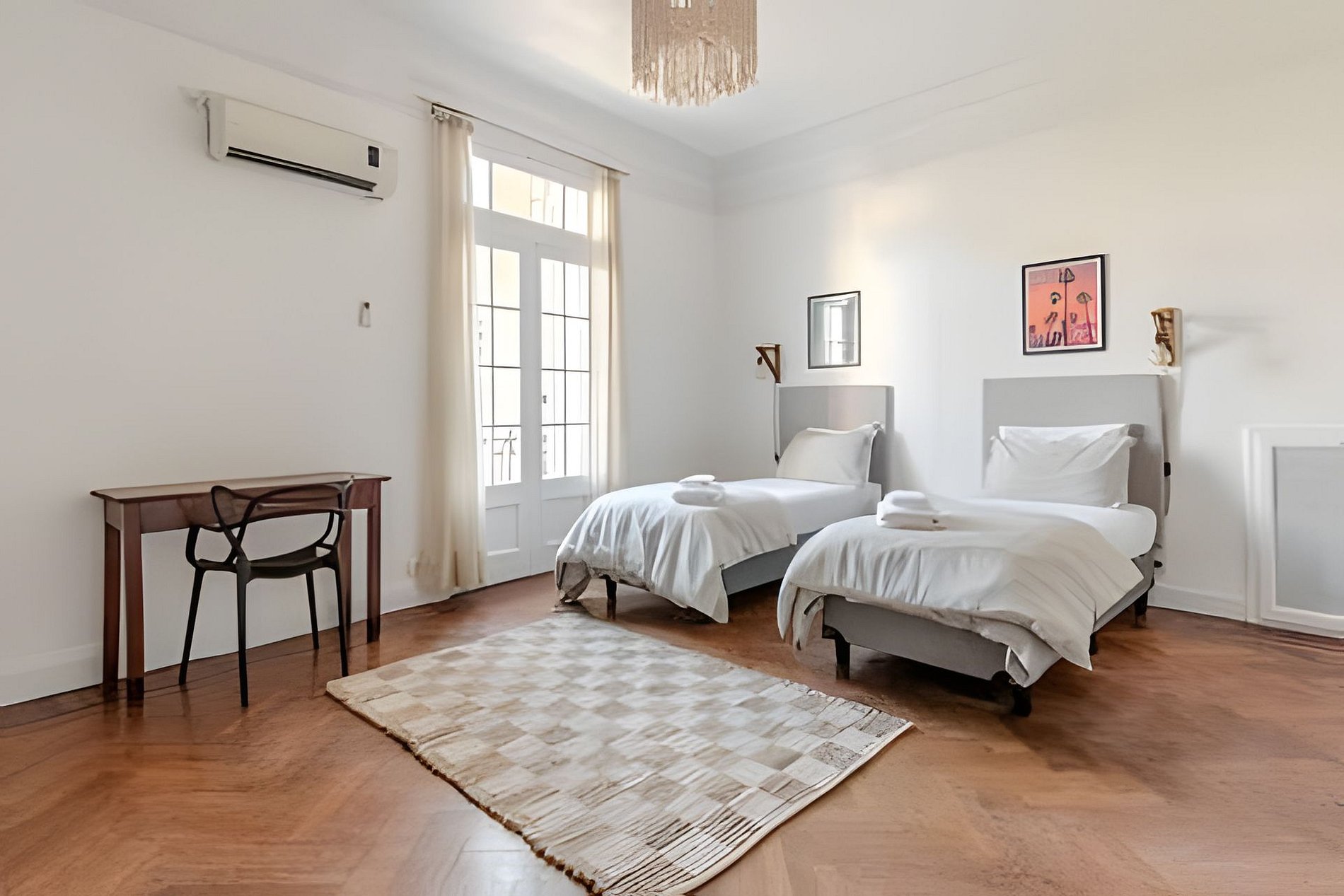 Classic-style apartment with high ceilings and spacious rooms. Located at the front with a balcony, it is very bright. Situated on Jujuy Avenue and just steps from Pueyrredón and Rivadavia Avenues, the apartment offers excellent access to all public transportation. Features air conditioning, gas heating, a double bed, and two single beds. Perfect for families.
