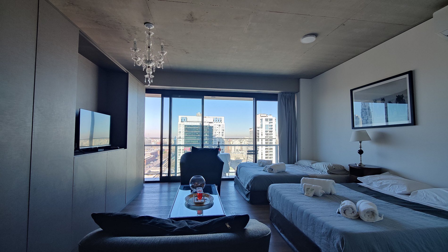 El departamento está totalmente equipado para alojar cómodamente hasta 4 personas, con mobiliario de calidad y una vista imponente a la zona de Puerto Madero desde un piso alto.