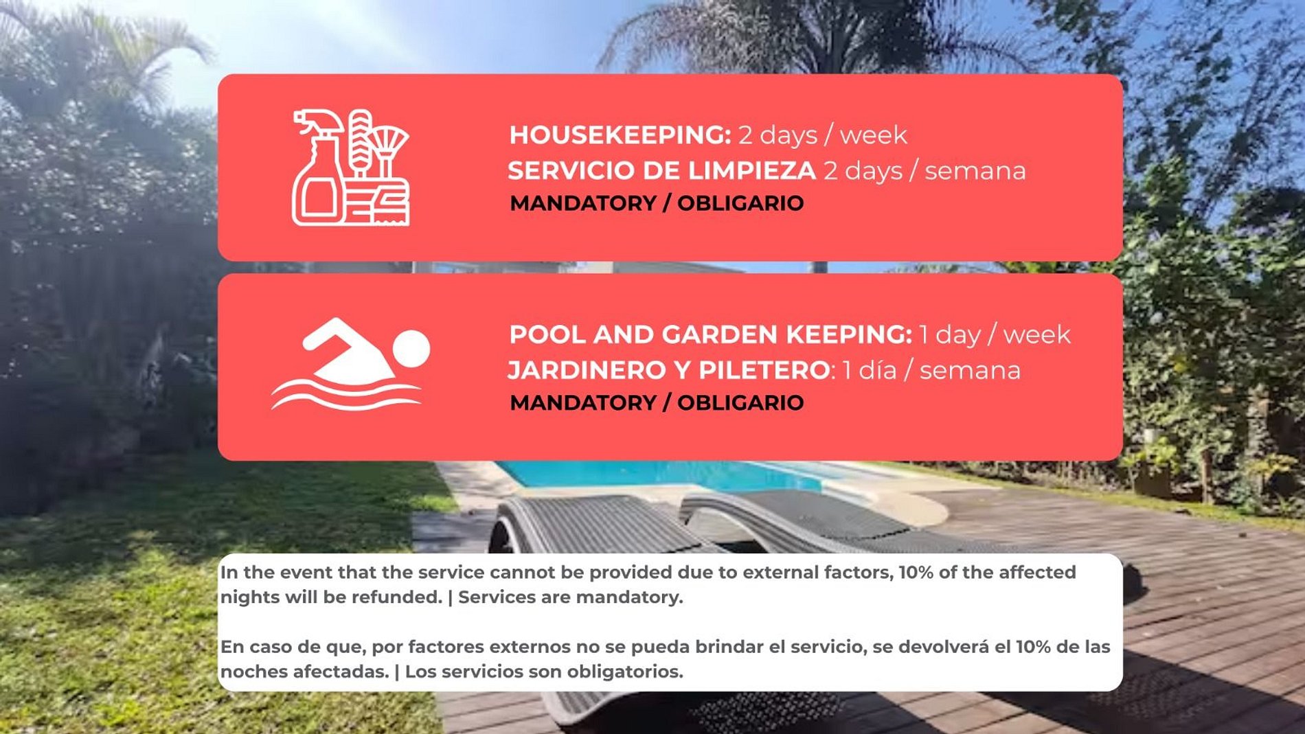 Para garantizar el confort se incluye obligatoriamente limpieza + jardinería/piletero 1 vez por semana