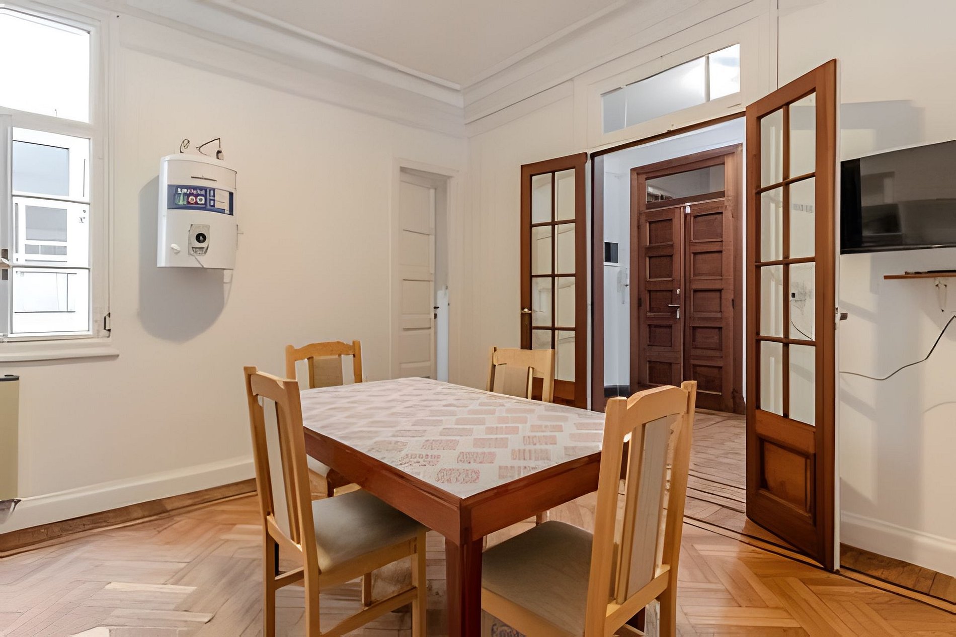 Apartamento de estilo clásico, techos altos y espacios amplios. Al frente y con balcón, muy luminoso. Ubicado sobre la avenida Jujuy y a pasos de la avenida Pueyrredón y la Avenida Rivadavia, es un apartamento que tiene excelente conexión con todos los medios de transporte. Cuenta con aire acondicionado, calefacción a gas, cama doble y dos camas individuales. Ideal para familias. Por seguridad de los huéspedes cuenta con cámaras de seguridad en el pasillo de entrada al edificio y los departamentos (espacios comunes).