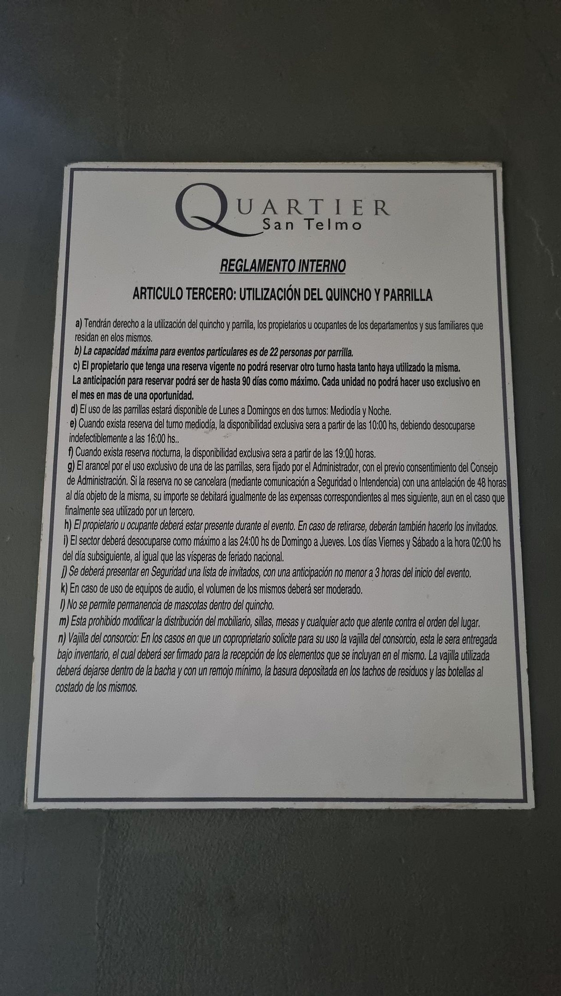 Piscina y solárium: No se permiten invitados los fines de semana ni feriados. Ducharse antes de ingresar. Prohibido música sin auriculares, envases de vidrio y conductas inapropiadas.